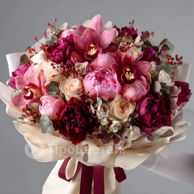 Букет с пионами «Рубиновая вуаль»