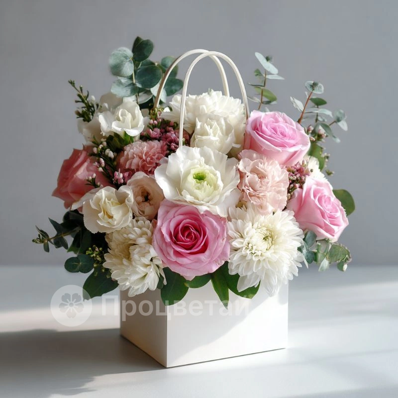 Цветочная композиция в пастельных тонах словно создана для романтичных и трепетных моментов. Отлично подойдёт для подарка подруге, сестре или любимой.