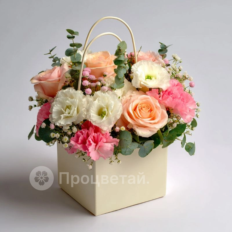 ГлавнаяКаталогКомпозицииЦветы в сумочке «Миниатюрное вдохновение»
