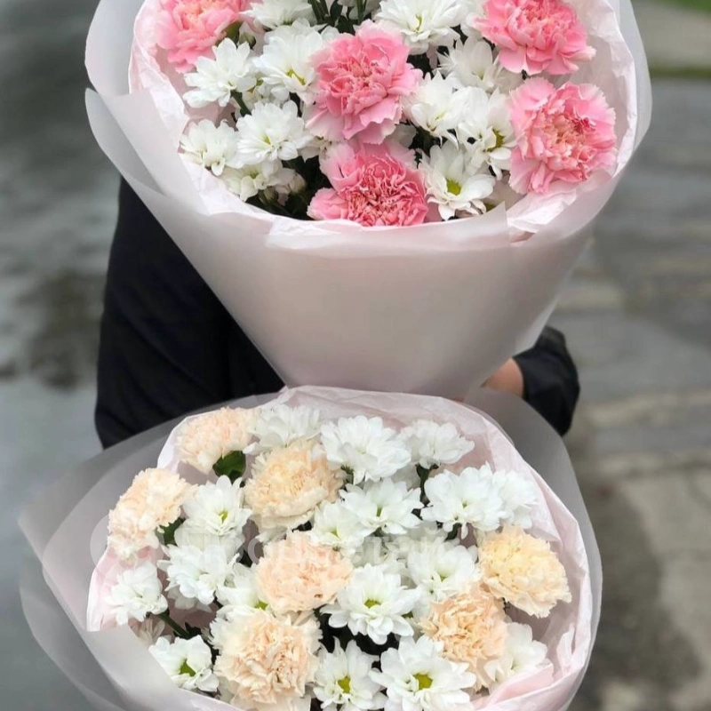 Нежное сочетание розовых гвоздик и пышных хризантем, обернутых в элегантную упаковку. Этот букет идеально подойдет для выражения нежности и заботы, добавляя яркие краски в любой повод.