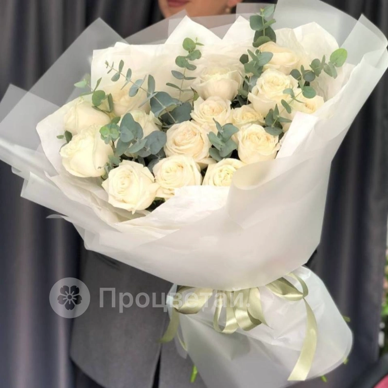 Этот букет - воплощение элегантности и нежности. Изысканные белые розы, переплетенные с эвкалиптом, создают утонченную композицию, наполненную свежестью и благородством. Он станет идеальным подарком, выражающим чистоту чувств и восхищение.
