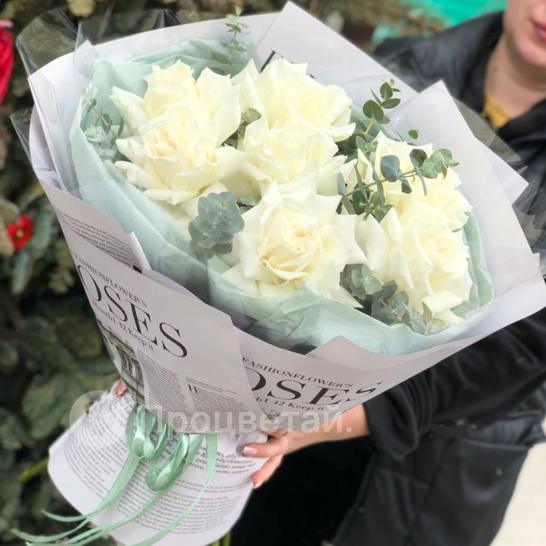 Нежный букет из белоснежных роз, воплощающий чистоту и элегантность. Изысканное сочетание роз с эвкалиптом создает атмосферу свежести и утонченности. Этот букет станет идеальным подарком, выражающим искренние чувства.