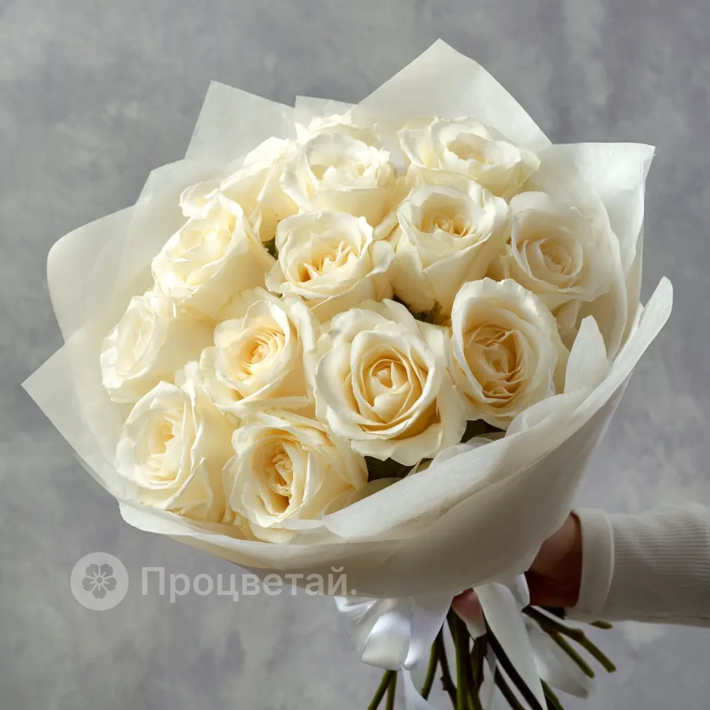 Невесомый и светлый букет из 15 белых роз высотой 40 см — символ чистоты и уважения. Идеален для официальных поздравлений, школьных мероприятий и трогательных моментов.